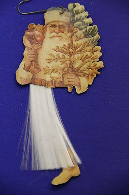 Antique Diecut Spun Glass Santa Green Hat Christmas Ornament Victorian Scrap VGC