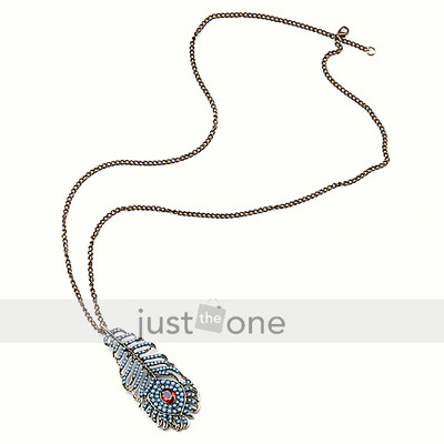 Title (ebay affiliate link): Retro Antique Bronze Style Necklace with Peacock Tail Rhinestone Feather Pendant