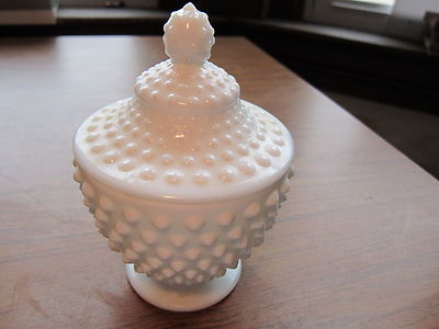 Title (ebay affiliate link): Fenton hobnail milk glass lidded candy dish 7.5" tall NM pre 1970