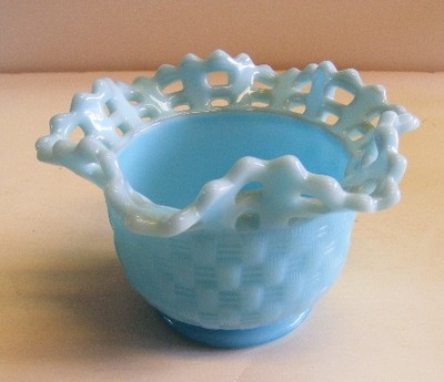 FENTON BLUE MILK GLASS BASKET WEAVE OPEN LACE BOWL