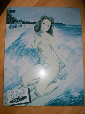Title (ebay affiliate link): REPRODUCTION VINTAGE METAL SIGN DUKE'S DOLLs SURF CLUB HAWAII WOODIE LONG BOARD
