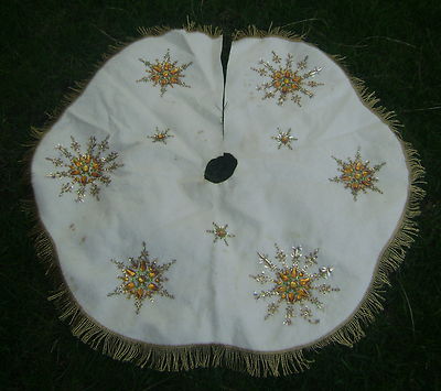 Title (ebay affiliate link): Vintage 3 Ft Felt Christmas Tree Skirt with Glass Beads, Amber Gems & Gold Trim