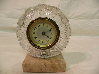 Title (ebay affiliate link): ANTIQUE AMERICAN LUX CLOCK IN CUT GLASS CASE ON A PINK MARBLE BASE RUNNING FINE