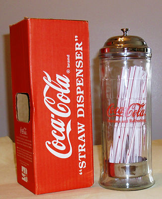 Title (ebay affiliate link): New Coca~Cola Brand Glass Straw Dispenser Retro Soda Fountain Design Metal Lid