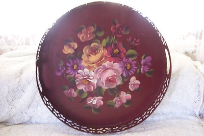 Title (ebay affiliate link): VINTAGE TOLEWARE TOLE WARE TRAY HAND PAINTED FLOWERS OPEN WORK TAG ON BACK 40's