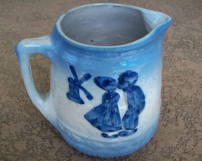 ANTIQUE BLUE & WHITE STONEWARE PITCHER DUTCH KIDS WINDMILL
