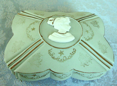 Title (ebay affiliate link): Vtg. Victorian Lady Cameo LIDDED DRESSER TRINKET BOX Sage Green Gold Trim B-666