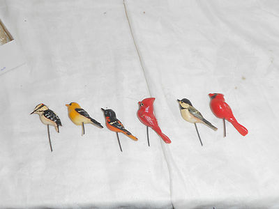 Title (ebay affiliate link): 6 vtg HAND CARVED small bird~s w/spikes CARDINAL/WOODPECKER/GOLDFINCH/blackbird