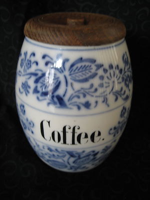 Blue Onion Design: Vintage Germany:5 3/4" Canister: COFFEE: Wooden Lid :
