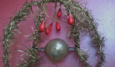 Antique Silver & Gold Tinsel Hanging Ornament Mercury Glass Ball Red Berries