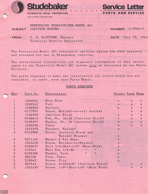 STUDEBAKER AVANTI ORIGINAL SERVICE LETTER J-1964-9