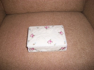 Title (ebay affiliate link): BEAUTIFUL VINTAGE WESTMORELAND MILK GLASS COVERED BOX WITH HAND PAINTED FLOWERS