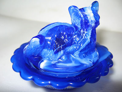 Cobalt blue and milk slag glass salt cellar celt cat kitten on nest basket dish