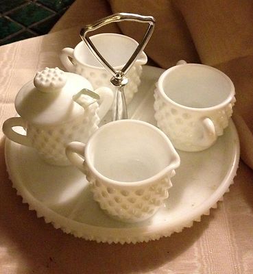 Title (ebay affiliate link): FENTON WHITE HOBNAIL MILK GLASS TRAY CREAMERS 1 SUGAR BOWL JAM JAR AND SPOON