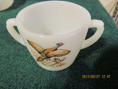 Title (ebay affiliate link): FIRE KING DESSERT SUGAR BOWL-MILK GLASS,GAME BIRDS-RING NECKED PHEASANT ,GOOD!