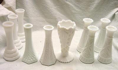 Title (ebay affiliate link): 10 vintage white milk glass bud vases 6" great for weddings Fancy design