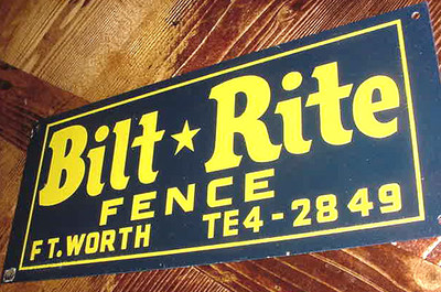 OLD 1940's CHAIN / GATE TOPPER METAL SIGN "BILT RITE FENCE FORT WORTH TE4-2849"