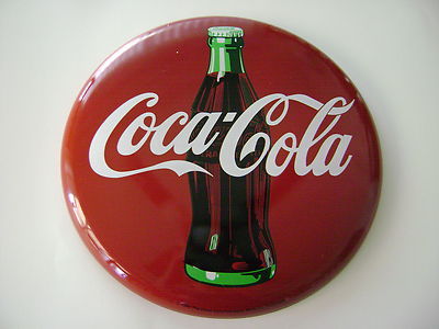 Title (ebay affiliate link): 1990 COKE Coca-Cola brand Button Sign 12" Metal Nice Condition!