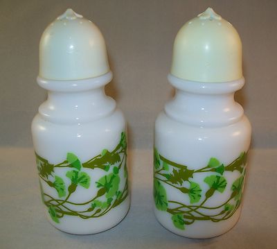 Vintage Set of Milk Glass Salt & Pepper Shakers with Green Morning Glories