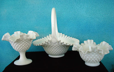 Title (ebay affiliate link): VINT LOT OF 3 MILK GLASS FENTON HOBNAIL BASKET & 2 RUFFLED BOWLS~EXCLT~BEAUTIFUL