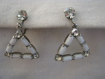 Title (ebay affiliate link): VINTAGE MILK GLASS & CLEAR FACETED RHINESTONES ST DANGLE SCREWBACK EARRINGS
