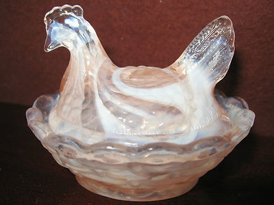 Title (ebay affiliate link): pink and milk slag glass salt celt hen chicken on nest basket dish rooster white