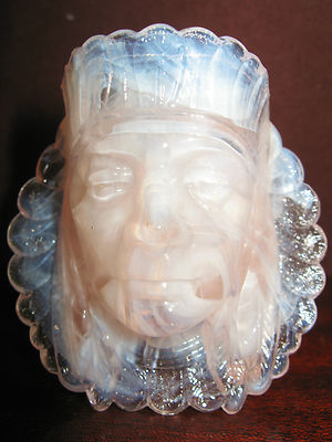 Pink milk slag glass tabletop toothpick holder Indian head chief match cranberry