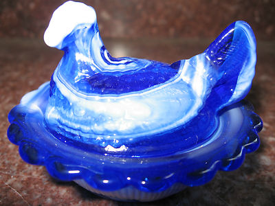 Title (ebay affiliate link): Cobalt blue & milk slag glass salt cellar hen chicken on nest basket dish white