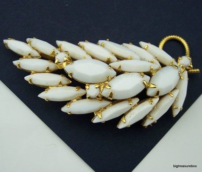 Title (ebay affiliate link): Vintage Brooch Pin White Milk Glass Rhinestone Leaf Gold tone Jewelry Costume -