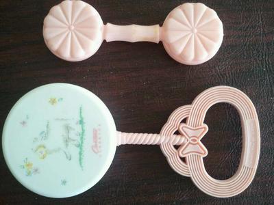 two 2 vintage hard plastic baby rattles pink lamb Carter's Classics
