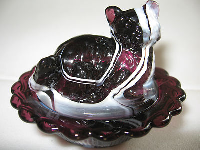 Title (ebay affiliate link): Amethyst purple & milk slag glass salt celt cat kitten kitty on nest basket dish