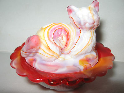 Ruby Red & milk slag glass salt cellar celt cat kitten kitty on nest basket dish