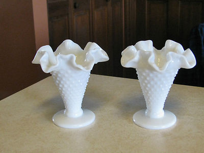 Title (ebay affiliate link): VINTAGE PAIR OF FENTON HOBNAIL VASES CRIMPED & RUFFLED RIMS WHITE MILK GLASS