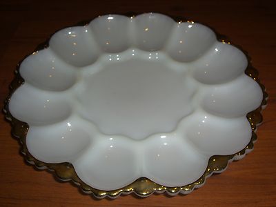 Title (ebay affiliate link): Beautiful Gold Trimmed 1950s Fire King Milk Glass Deviled Egg Plate 10" Round