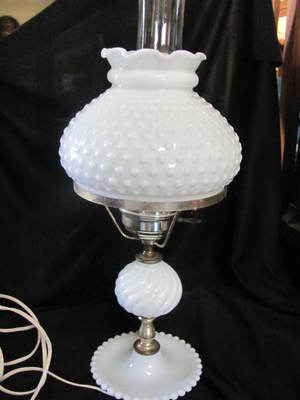Title (ebay affiliate link): Vintage 20 1/2" White Milk Glass Hob Knob Chimney Table Lamp Works