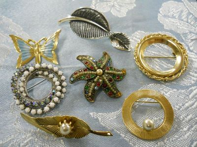 LOT 7 VTG BROOCHES PINS RHINESTONES, MILK GLASS SETS
