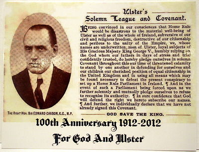 Title (ebay affiliate link): 100th ANNIVERSARY ULSTER SOLEMN LEAGUE AND COVENANT POSTCARD SIR EDWARD CARSON