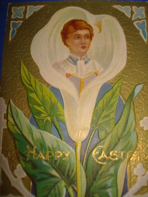 ANTIQUE OLD Holiday EASTER postcard CHOIR BOY - KID child - PEACE LILY FLOWER