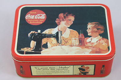 Title (ebay affiliate link): COCA-COLA ADV VTG STYLE MOTHER & DAUGHTER SEWING MACHINE POP BOTTLE METAL TIN