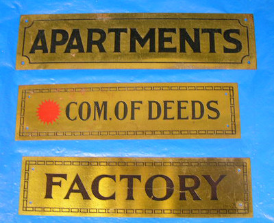 Title (ebay affiliate link): 3 Vintage Heavy BRASS -- DOOR / Wall Signs-- FACTORY-APTS- Com of DEEDS
