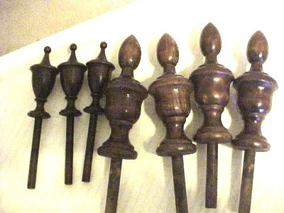Title (ebay affiliate link): 7 OLD DARK WOOD KNOBS OR FINIALS FOR BEDS OR CABINETS