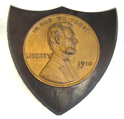 Title (ebay affiliate link): Lincolln Head Cent Wall Plaque Dated 1910 - Cast Iron/Gold Paint - 16 x 17 In.