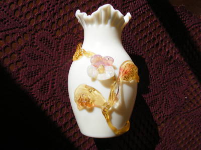 HANDBLOWN VASE WITH CRIMPED EDGE AND APPLIED FLOWERS