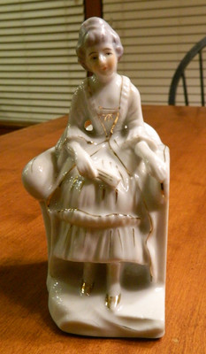 Title (ebay affiliate link): Vintage figurine of woman sitting on chair white with gold trim. Made in Japan.