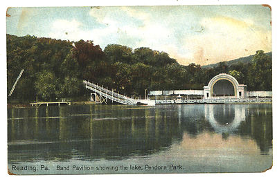 Title (ebay affiliate link): READING, PA. BAND PAVILION SHOWING THE LAKE, PENDORA PARK. WATER CHUTE.