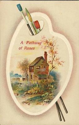 Title (ebay affiliate link): Artist PALETTE & BRUSHES "A Pathway of Roses" Farmhouse - 1912 Greeting Postcard