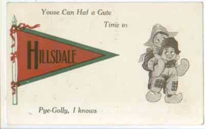 1912 antique PENNANT POSTCARD Hillsdale Mich Michigan Dutch Boy Girl novelty OOP