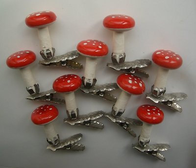 Title (ebay affiliate link): 9 OLD CLIP-ON SPUN COTTON MUSHROOMS CHRISTMAS ORNAMENTS