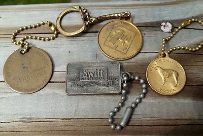 Title (ebay affiliate link): 4~ Vintage Keychains~Key Fobs~Seagram's Whiskey~Wolfschmidt's Vodka~7-UP~Swift