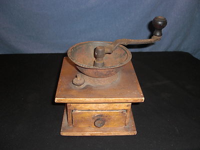 Title (ebay affiliate link): ANTIQUE CAST IRON AND WOOD COFFEE GRINDER "MAKER MARKS ON CRANK/HANDLE